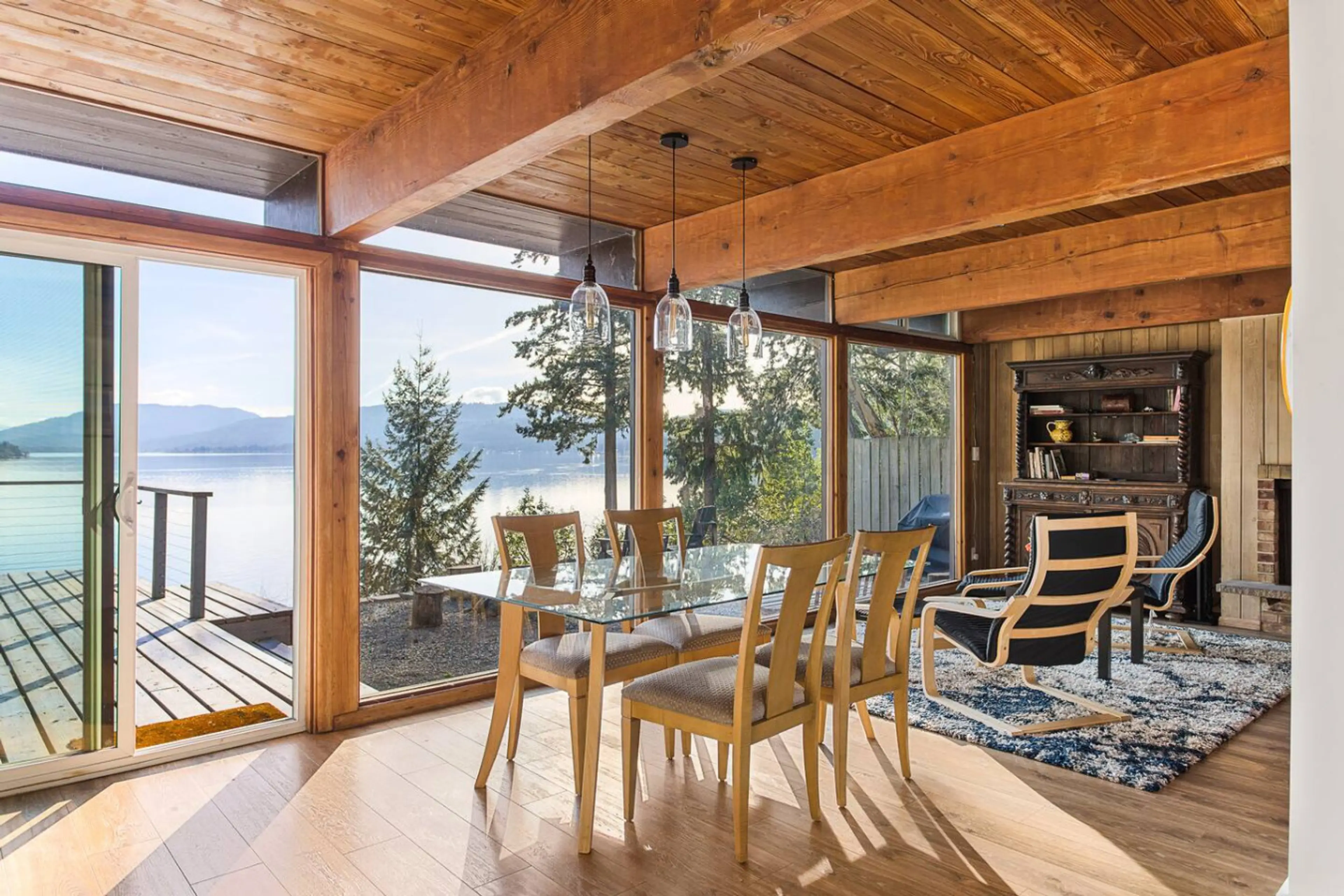 Renovated mid-century waterfront home with stunning lake and mountain views. Entire house + all around it is yours! Features a large deck, wood fireplace, outdoor fire pit, gas BBQ, private dock with diving board, and access to a semi-private outdoor sauna. Swim, paddle, or just relax. This retreat ...